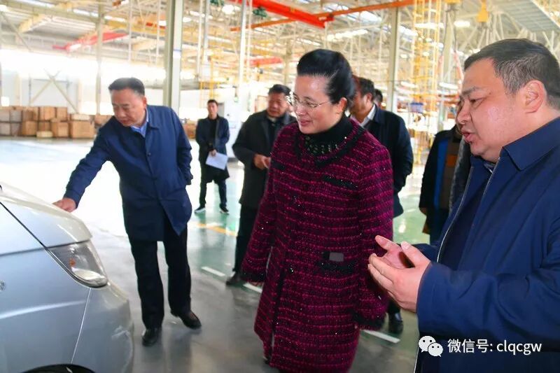 程阿羅總經(jīng)理(右一)如數(shù)家珍地向郭市長(zhǎng)介紹新能源車(chē)的情況。