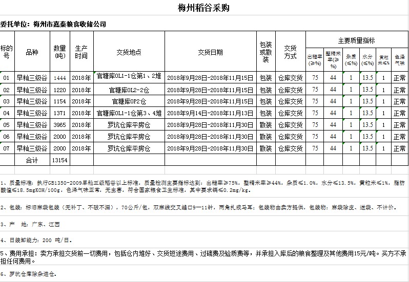 受客戶委托,梅州市嘉應(yīng)糧食交易中心有限公司定于2018年9月5日(星期三)舉辦糧食競價交易會,梅州市嘉泰糧食收儲公司擬采購2018年早秈稻13154噸。