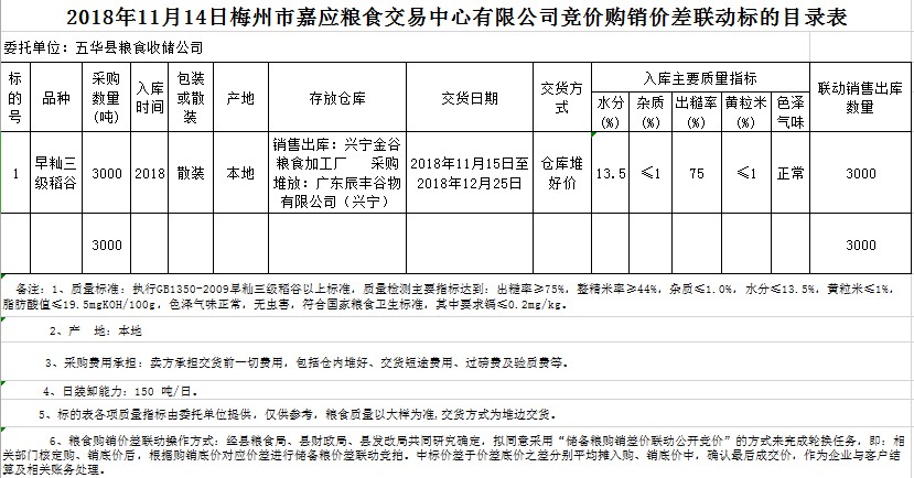 受客戶委托,梅州市嘉應(yīng)糧食交易中心有限公司定于2018年11月14日(星期三)舉辦稻谷購(gòu)銷價(jià)差聯(lián)動(dòng)標(biāo)的交易會(huì),五華縣糧食收儲(chǔ)公司擬銷售和采購(gòu)早秈稻3000噸。