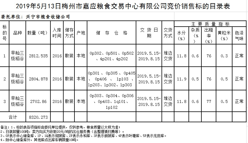 受客戶委托,梅州市嘉應(yīng)糧食交易中心有限公司定于2019年5月13日(星期一)舉辦糧食競價(jià)交易會(huì),興寧市糧食收儲(chǔ)公司擬銷售2016年早秈稻8320.273噸。