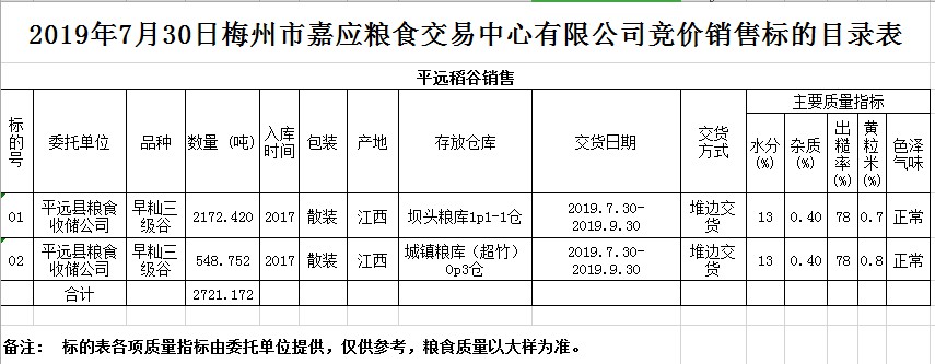 受客戶委托,梅州市嘉應(yīng)糧食交易中心有限公司定于2019年7月30日(星期二)舉辦糧食競(jìng)價(jià)交易會(huì),平遠(yuǎn)縣糧食收儲(chǔ)公司擬銷售2017年早秈稻2721.172噸。