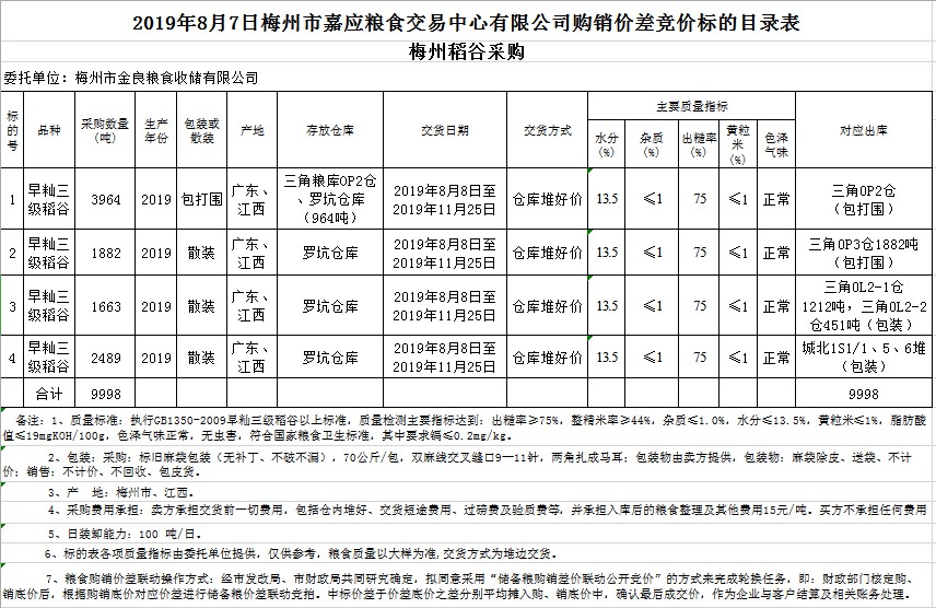 受客戶委托,梅州市嘉應(yīng)糧食交易中心有限公司定于2019年8月7日(星期三)舉辦稻谷購銷價差聯(lián)動標的交易會,梅州市金良糧食收儲有限公司擬銷售和采購早秈稻9998噸。