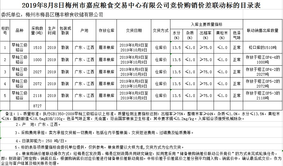 受客戶委托,梅州市嘉應(yīng)糧食交易中心有限公司定于2019年8月8日(星期四)舉辦稻谷購銷價差聯(lián)動標的交易會,梅州市梅縣區(qū)穗豐糧食收儲有限公司擬銷售和采購早秈稻8727噸。