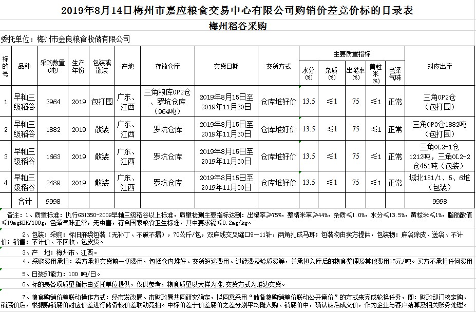 交易時間和地點:2019年8月14日(星期三)上午10時。廣東省梅州市彬芳大道南161號梅州市糧食交易中心3樓。