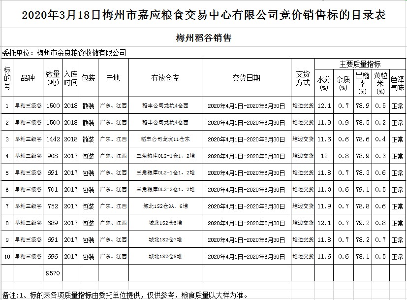 受客戶(hù)委托,梅州市嘉應(yīng)糧食交易中心有限公司定于2020年3月18日(星期三)舉辦糧食競(jìng)價(jià)交易會(huì),梅州市金良糧食收儲(chǔ)有限公司擬銷(xiāo)售2017年、2018年早秈稻9570噸。