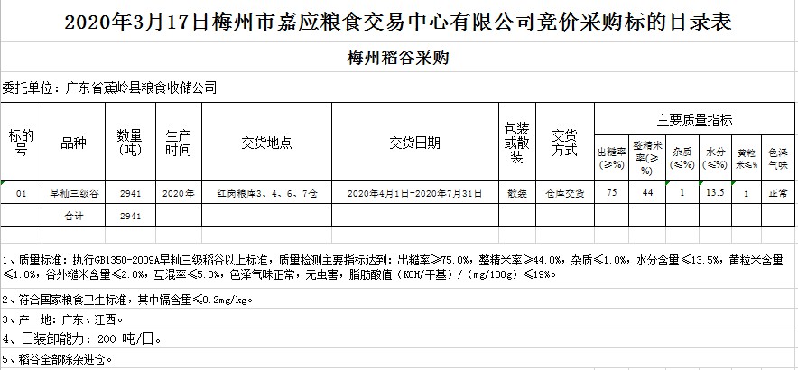 受客戶委托,梅州市嘉應(yīng)糧食交易中心有限公司定于2020年3月17日(星期二)舉辦糧食競(jìng)價(jià)交易會(huì),廣東省蕉嶺縣糧食收儲(chǔ)公司擬采購(gòu)2020年早秈稻2941噸。