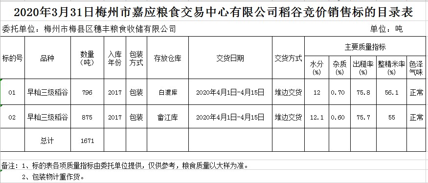 受客戶委托,梅州市嘉應(yīng)糧食交易中心有限公司定于2020年3月31日(星期二)舉辦糧食競價交易會,梅州市梅縣區(qū)穗豐糧食收儲有限公司擬銷售2017年早秈稻1671噸。