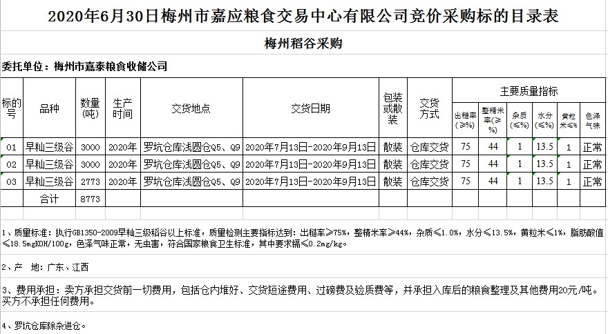 受客戶委托,梅州市嘉應(yīng)糧食交易中心有限公司定于2020年6月30日(星期二)舉辦糧食競(jìng)價(jià)交易會(huì),梅州市嘉泰糧食收儲(chǔ)公司擬采購(gòu)2020年早秈稻8773噸。
