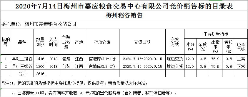 受客戶委托,梅州市嘉應(yīng)糧食交易中心有限公司定于2020年7月14日(星期二)舉辦糧食競(jìng)價(jià)交易會(huì),梅州市嘉泰糧食收儲(chǔ)公司擬銷售2018年早秈稻2616噸。