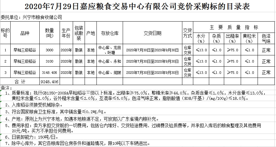 受客戶委托,梅州市嘉應糧食交易中心有限公司定于2020年7月29日(星期三)舉辦糧食競價交易會,興寧市糧食收儲公司擬采購2020年早秈稻9248.406噸。