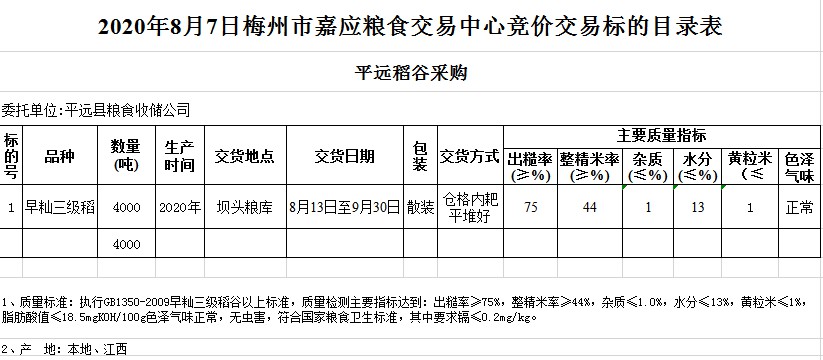 受客戶委托,梅州市嘉應(yīng)糧食交易中心有限公司定于2020年8月7日(星期五)舉辦糧食競價(jià)交易會(huì),平遠(yuǎn)縣糧食收儲(chǔ)公司擬采購2020年早秈稻4000噸。