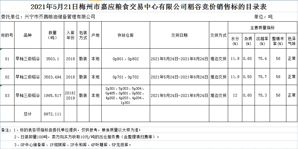 受客戶委托,梅州市嘉應(yīng)糧食交易中心有限公司定于2021年5月21日(星期五)舉辦糧食競價(jià)交易會(huì)。興寧市齊昌糧油儲(chǔ)備管理有限公司擬銷售2018、2019年早秈稻8972.111噸。
