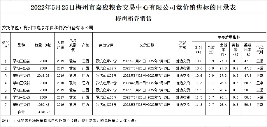 受客戶委托,梅州市嘉應(yīng)糧食交易中心有限公司定于2022年5月25日(星期三)舉辦糧食競價(jià)交易會(huì)。梅州市嘉泰糧食和物資儲(chǔ)備有限公司擬銷售2019年早秈稻13078.78噸。