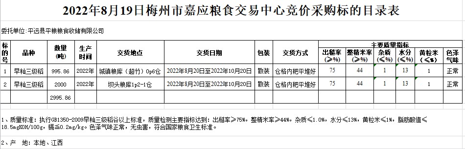 受客戶委托,梅州市嘉應(yīng)糧食交易中心有限公司定于2022年8月19日(星期五)舉辦糧食競價(jià)交易會(huì)。平遠(yuǎn)縣平糧糧食收儲有限公司擬采購2022年早秈稻2995.86噸。