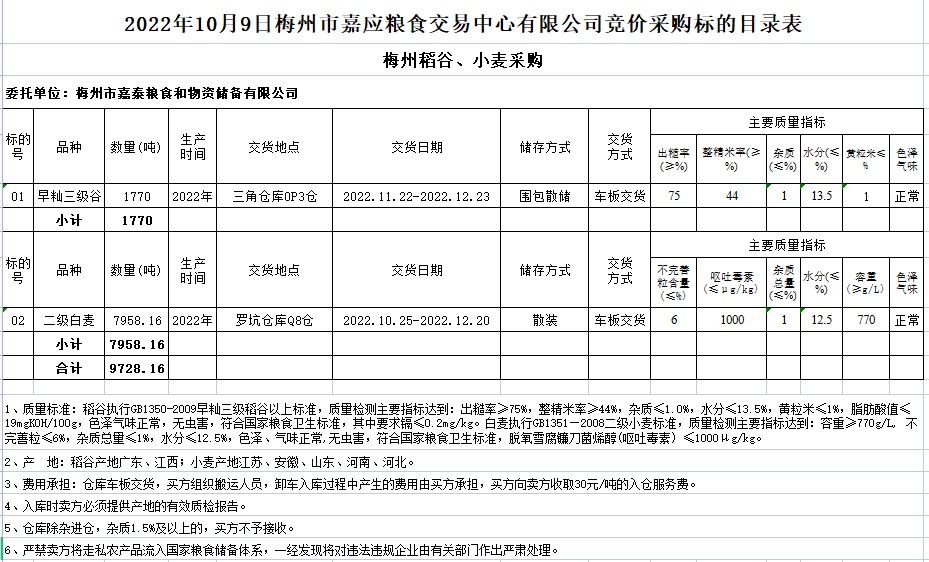 受客戶委托,梅州市嘉應(yīng)糧食交易中心有限公司定于2022年10月9日(星期日)舉辦糧食競(jìng)價(jià)交易會(huì)。梅州市嘉泰糧食和物資儲(chǔ)備有限公司擬采購(gòu)2022年早秈稻1770噸、二級(jí)白麥7958.16噸。