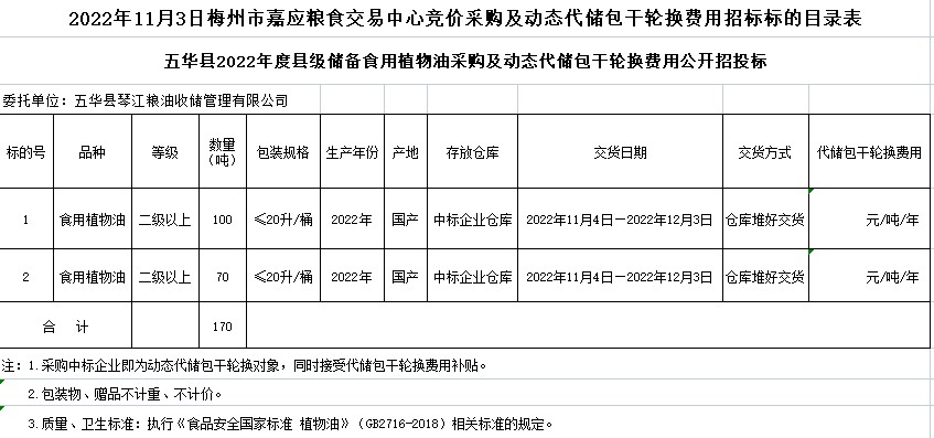 食用植物油170噸,等級(jí)二級(jí)以上、包裝規(guī)格≤20升/桶, 動(dòng)態(tài)代儲(chǔ)包干輪換期限為三年。