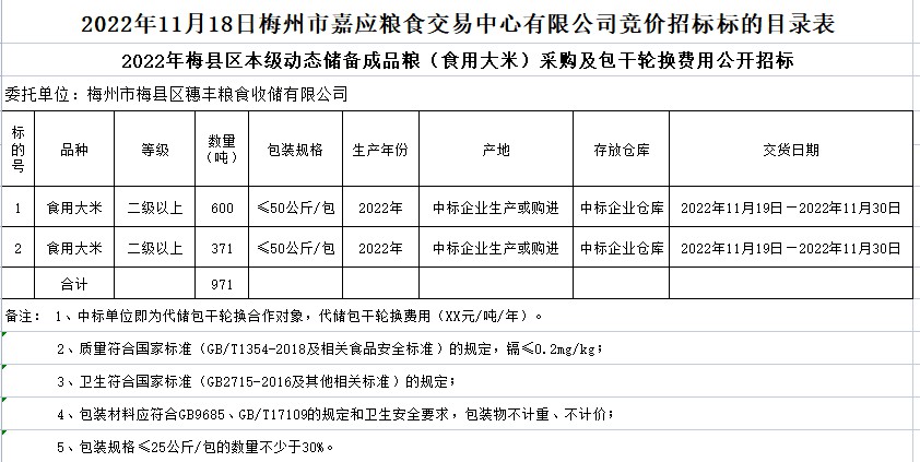 受客戶委托,梅州市嘉應(yīng)糧食交易中心有限公司定于2022年11月18日(星期五)上午10時在廣東省梅州市彬芳大道南161號梅州市糧食交易中心3樓,舉辦梅縣區(qū)本級成品糧動態(tài)儲備代儲采購及包干輪換公開招標(biāo)。