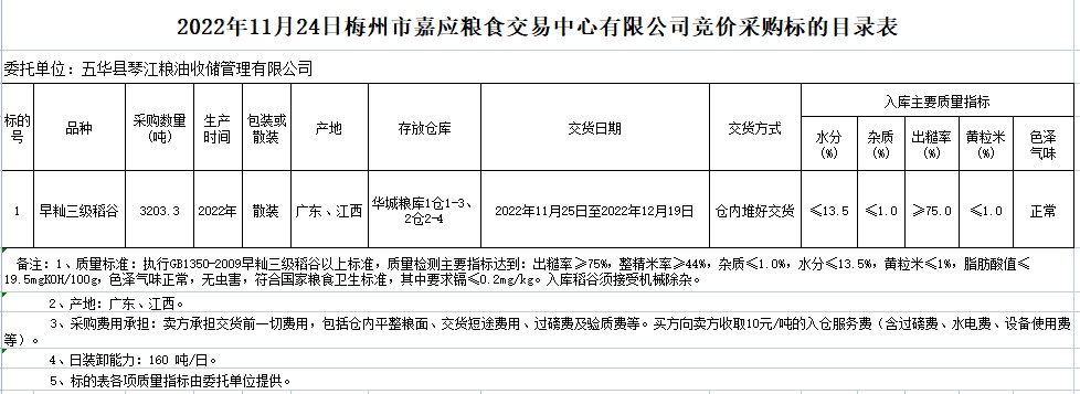 受客戶委托,梅州市嘉應(yīng)糧食交易中心有限公司定于2022年11月24日(星期四)舉辦糧食競(jìng)價(jià)交易會(huì)。五華縣琴江糧油收儲(chǔ)管理有限公司擬采購(gòu)2022年早秈稻3203.3噸。