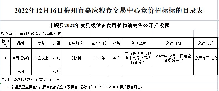 受客戶委托,梅州市嘉應(yīng)糧食交易中心有限公司定于2022年12月16日(星期五)舉辦食用植物油競(jìng)價(jià)交易會(huì)。豐順縣糧食收儲(chǔ)有限公司擬銷售2022年食用植物油45噸。