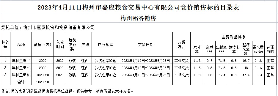 受客戶委托,梅州市嘉應(yīng)糧食交易中心有限公司定于2023年4月11日(星期二)舉辦糧食競(jìng)價(jià)交易會(huì)。梅州市嘉泰糧食和物資儲(chǔ)備有限公司擬銷售2020年早秈稻5820.58噸。