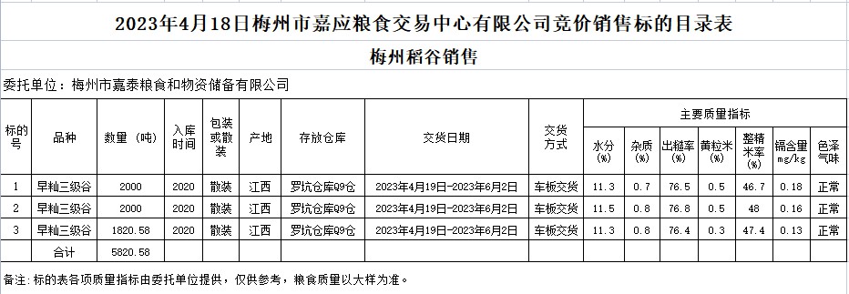 受客戶委托,梅州市嘉應(yīng)糧食交易中心有限公司定于2023年4月18日(星期二)舉辦糧食競價交易會。梅州市嘉泰糧食和物資儲備有限公司擬銷售2020年早秈稻5820.58噸。