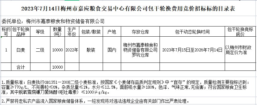 受客戶委托,梅州市嘉應糧食交易中心有限公司定于2023年7月14日(星期五)上午10時15分在梅州市嘉應糧食交易中心有限公司舉辦梅州市市級儲備糧小麥包干輪換(自主輪換)公開招標。