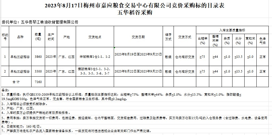 受客戶委托,梅州市嘉應糧食交易中心有限公司定于2023年8月17日(星期四)舉辦糧食競價交易會。五華縣琴江糧油收儲管理有限公司擬采購2023年早秈稻7160噸。