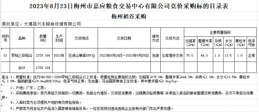 受客戶委托,梅州市嘉應(yīng)糧食交易中心有限公司定于2023年8月23日(星期三)舉辦糧食競價(jià)交易會。大埔縣興豐糧食收儲有限公司擬采購2023年早秈稻2728.164噸。