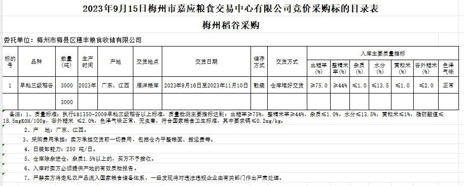 受客戶委托,梅州市嘉應(yīng)糧食交易中心有限公司定于2023年9月15日(星期五)舉辦糧食競價(jià)交易會(huì)。梅州市梅縣區(qū)穗豐糧食收儲(chǔ)有限公司擬采購2023年產(chǎn)早秈稻3000噸。