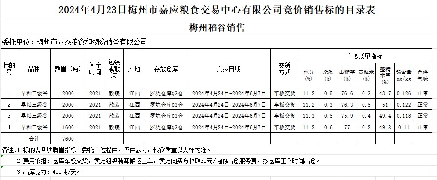 受客戶(hù)委托,梅州市嘉應(yīng)糧食交易中心有限公司定于2024年4月23日(星期二)舉辦糧食競(jìng)價(jià)交易會(huì)。梅州市嘉泰糧食和物資儲(chǔ)備有限公司擬銷(xiāo)售2021年產(chǎn)早秈稻7600噸。