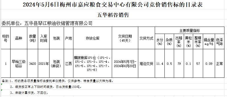 受客戶委托,梅州市嘉應糧食交易中心有限公司定于2024年5月6日(星期一)舉辦糧食競價交易會。五華縣琴江糧油收儲管理有限公司擬銷售2021年產(chǎn)早秈稻3420噸。