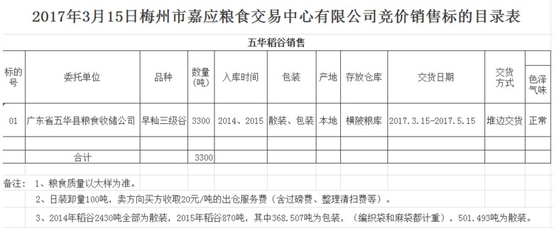 受客戶委托,梅州市嘉應(yīng)糧食交易中心有限公司定于2017年3月15日舉辦糧食競價交易會,廣東省五華縣糧食收儲公司擬銷售早秈三級稻谷3300噸。