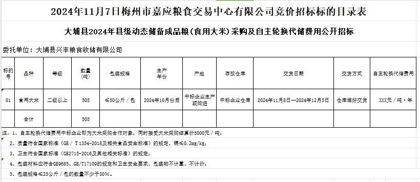 大埔縣2024年縣級動態(tài)儲備成品糧(食用大米)采購及自主輪換代儲費用公開招標(biāo)公告