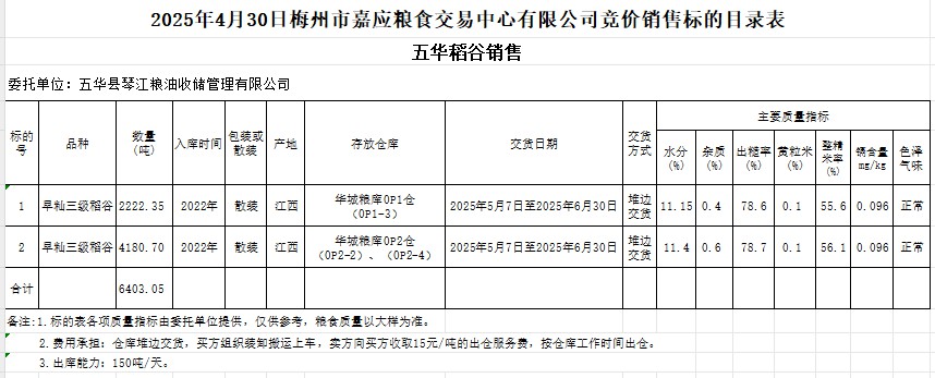 受客戶委托,梅州市嘉應(yīng)糧食交易中心有限公司定于2025年4月30日(星期三)舉辦糧食競(jìng)價(jià)交易會(huì)。五華縣琴江糧油收儲(chǔ)管理有限公司擬銷(xiāo)售2022年產(chǎn)早秈稻谷6403.05噸。