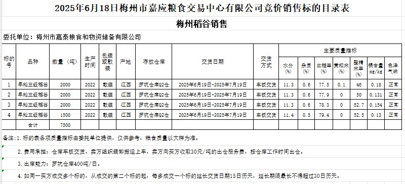 受客戶委托,梅州市嘉應(yīng)糧食交易中心有限公司定于2025年6月18日(星期三)舉辦糧食競(jìng)價(jià)交易會(huì)。梅州市嘉泰糧食和物資儲(chǔ)備有限公司擬銷售2022年產(chǎn)早秈稻谷7500噸。