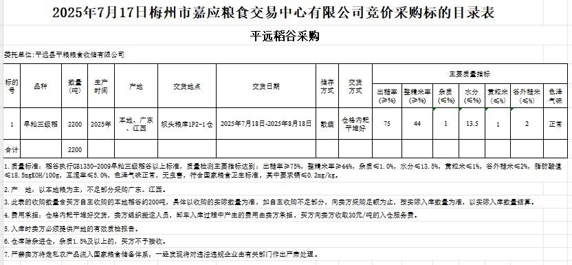 受客戶委托,梅州市嘉應糧食交易中心有限公司定于2025年7月17日(星期四)舉辦糧食競價交易會。平遠縣平糧糧食收儲有限公司擬采購2025年產(chǎn)早秈稻谷2200噸。
