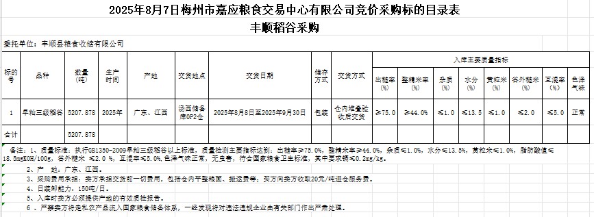 受客戶委托,梅州市嘉應(yīng)糧食交易中心有限公司定于2025年8月7日(星期四)舉辦糧食競(jìng)價(jià)交易會(huì)。豐順縣糧食收儲(chǔ)有限公司擬采購(gòu)2025年產(chǎn)早秈稻谷5207.878噸。