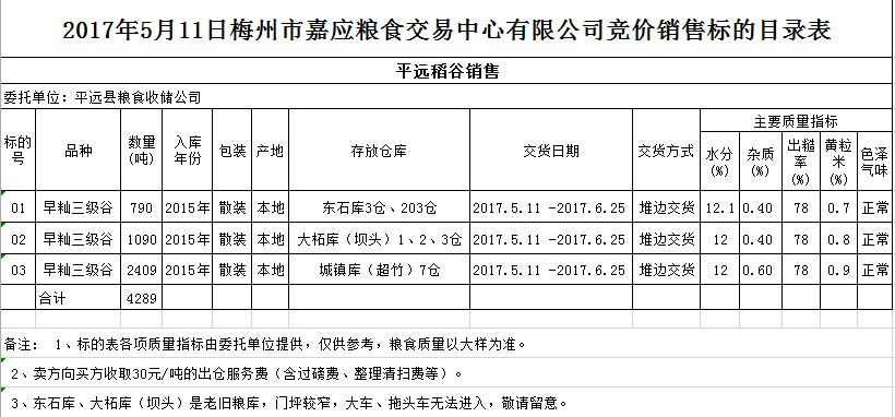 受客戶委托,梅州市嘉應(yīng)糧食交易中心有限公司定于2017年5月11日舉辦糧食競價交易會,平遠縣糧食收儲公司擬銷售2015年早秈三級稻谷4289噸。