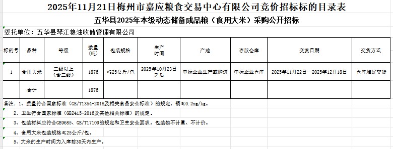 五華縣2025年本級動態(tài)儲備成品糧(食用大米)采購及代儲包干輪換費用公開招標(biāo)公告