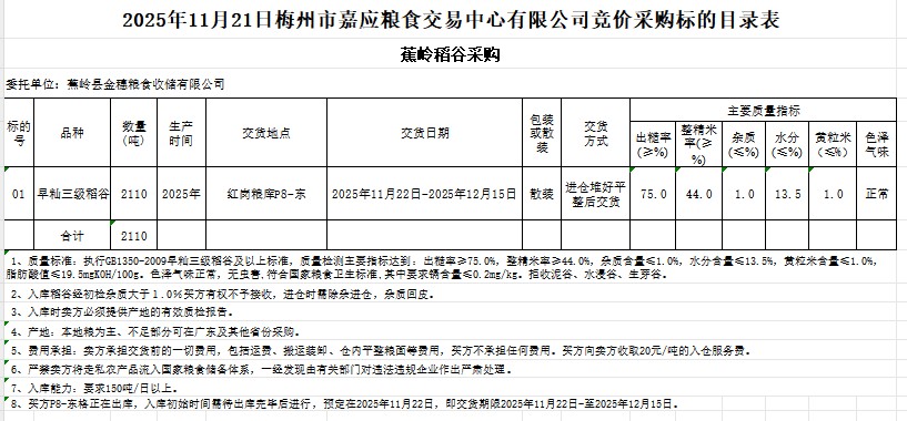 受客戶委托,梅州市嘉應(yīng)糧食交易中心有限公司定于2025年11月21日(星期五)舉辦糧食競價交易會。蕉嶺縣金穗糧食收儲有限公司采購2025年產(chǎn)早秈稻谷2110噸。
