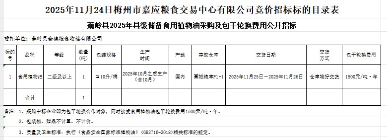 受蕉嶺縣金穗糧食收儲(chǔ)有限公司委托,梅州市嘉應(yīng)糧食交易中心有限公司定于2025年11月24日(星期一)上午10:00在廣東省梅州市彬芳大道南161號(hào)梅州市糧食交易中心3樓,舉辦蕉嶺縣2025年縣級(jí)儲(chǔ)備食用植物油采購(gòu)及包干輪換費(fèi)用公開招標(biāo)。