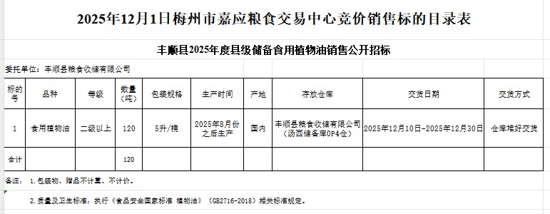 受客戶委托,梅州市嘉應糧食交易中心有限公司定于2025年12月1日(星期一)舉辦糧食競價交易會。豐順縣糧食收儲有限公司擬銷售2025年食用植物油120噸。