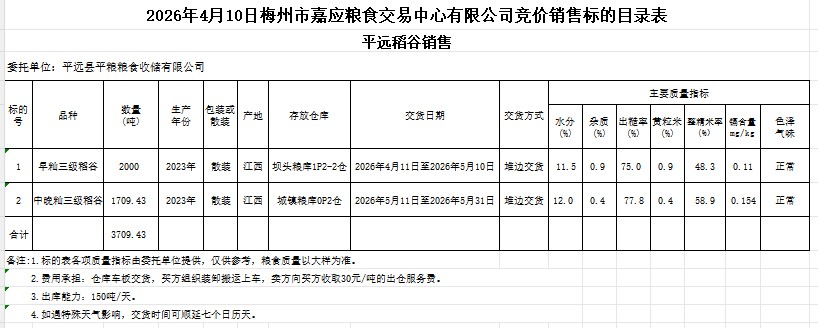 受客戶(hù)委托,梅州市嘉應(yīng)糧食交易中心有限公司定于2026年4月10日(星期五)舉辦糧食競(jìng)價(jià)交易會(huì)。平遠(yuǎn)縣平糧糧食收儲(chǔ)有限公司擬銷(xiāo)售2023年產(chǎn)早秈稻谷、中晚秈稻谷3709.43噸。