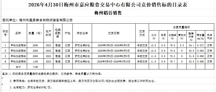 受客戶委托,梅州市嘉應(yīng)糧食交易中心有限公司定于2026年4月30日(星期四)舉辦糧食競價交易會。梅州市嘉泰糧食和物資儲備有限公司擬銷售2023年產(chǎn)早秈稻谷7100噸。