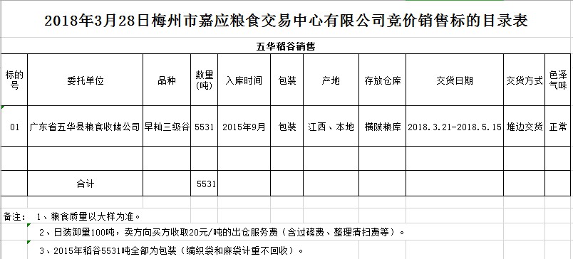 交易時間和地點:2018年3月28日(星期三)下午15時30分。廣東省梅州市彬芳大道南161號梅州市糧食交易中心3樓。