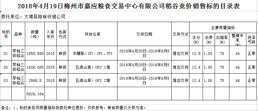受客戶委托,梅州市嘉應(yīng)糧食交易中心有限公司定于2018年4月19日(星期四)舉辦糧食競價交易會,大埔縣糧食收儲公司擬銷售早秈稻5928.164噸。