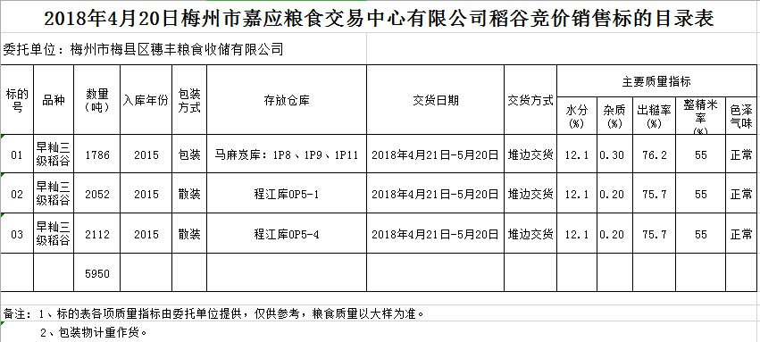 受客戶委托,梅州市嘉應(yīng)糧食交易中心有限公司定于2018年4月20日(星期五)舉辦糧食競價(jià)交易會(huì),梅州市梅縣區(qū)穗豐糧食收儲(chǔ)有限公司擬銷售早秈稻5950噸。
