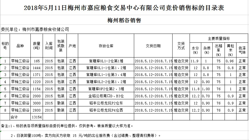 受客戶委托,梅州市嘉應(yīng)糧食交易中心有限公司定于2018年5月11日(星期五)舉辦糧食競(jìng)價(jià)交易會(huì),梅州市嘉泰糧食收儲(chǔ)公司擬銷售早秈稻13154噸。