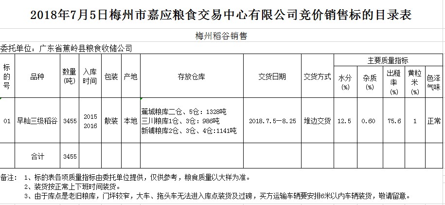 受客戶委托,梅州市嘉應糧食交易中心有限公司定于2018年7月5日(星期四)舉辦糧食競價交易會,廣東省蕉嶺縣糧食收儲公司擬銷售早秈稻3455噸。