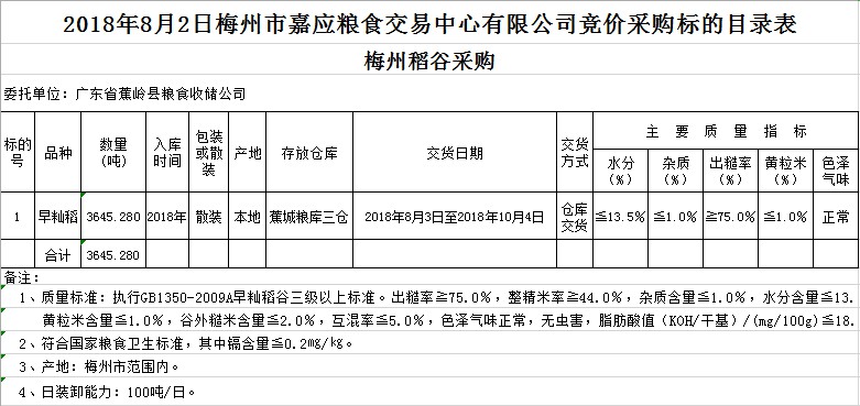 受客戶委托,梅州市嘉應(yīng)糧食交易中心有限公司定于2018年8月2日舉辦糧食競(jìng)價(jià)交易會(huì),廣東省蕉嶺縣糧食收儲(chǔ)公司擬采購(gòu)2018年產(chǎn)早秈三級(jí)稻谷3645.28噸。